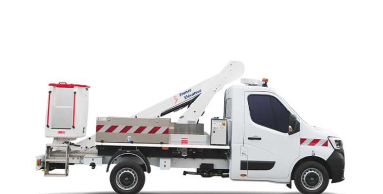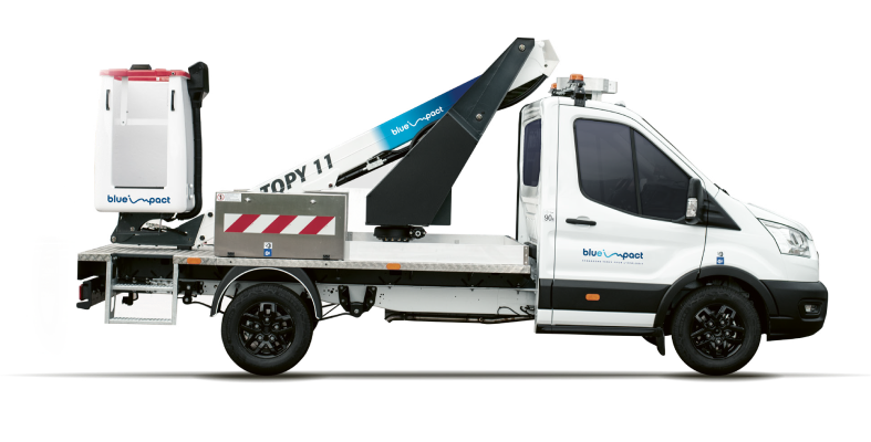 Montada sobre la nueva Ford E-Transit, totalmente eléctrica, funciona con la batería del camión y representa todos los avances necesarios que permiten una optimización de sus trabajos gracias a su simplicidad de uso y su versatilidad sobre la mayoría de los terrenos y pendientes, convirtiéndose así en el equipo idóneo para cualquier trabajo hasta los 11m de altura.